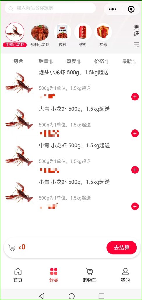 主要栏目分为 生鲜小龙虾,液氮小龙虾,佐料,饮料,红包。