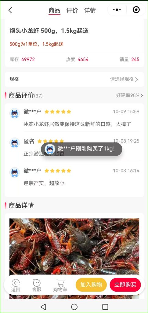 小程序流程简单,高效。适合本地需要零售购买小龙虾的客户。